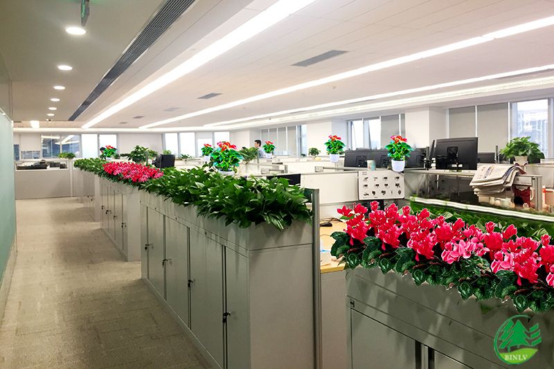 頭以及橡皮樹,在窗臺變出擺列比利時杜鵑,花色艷麗,辦公桌擺放君子蘭,會客臺面處擺放精致日式的插花藝術(shù),