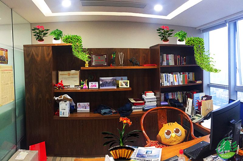 在辦公處,在書架上擺放佛珠、紅掌、文竹,桌面擺放君子蘭。